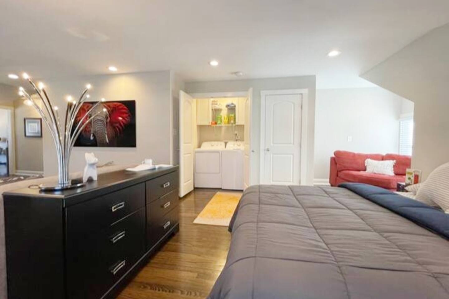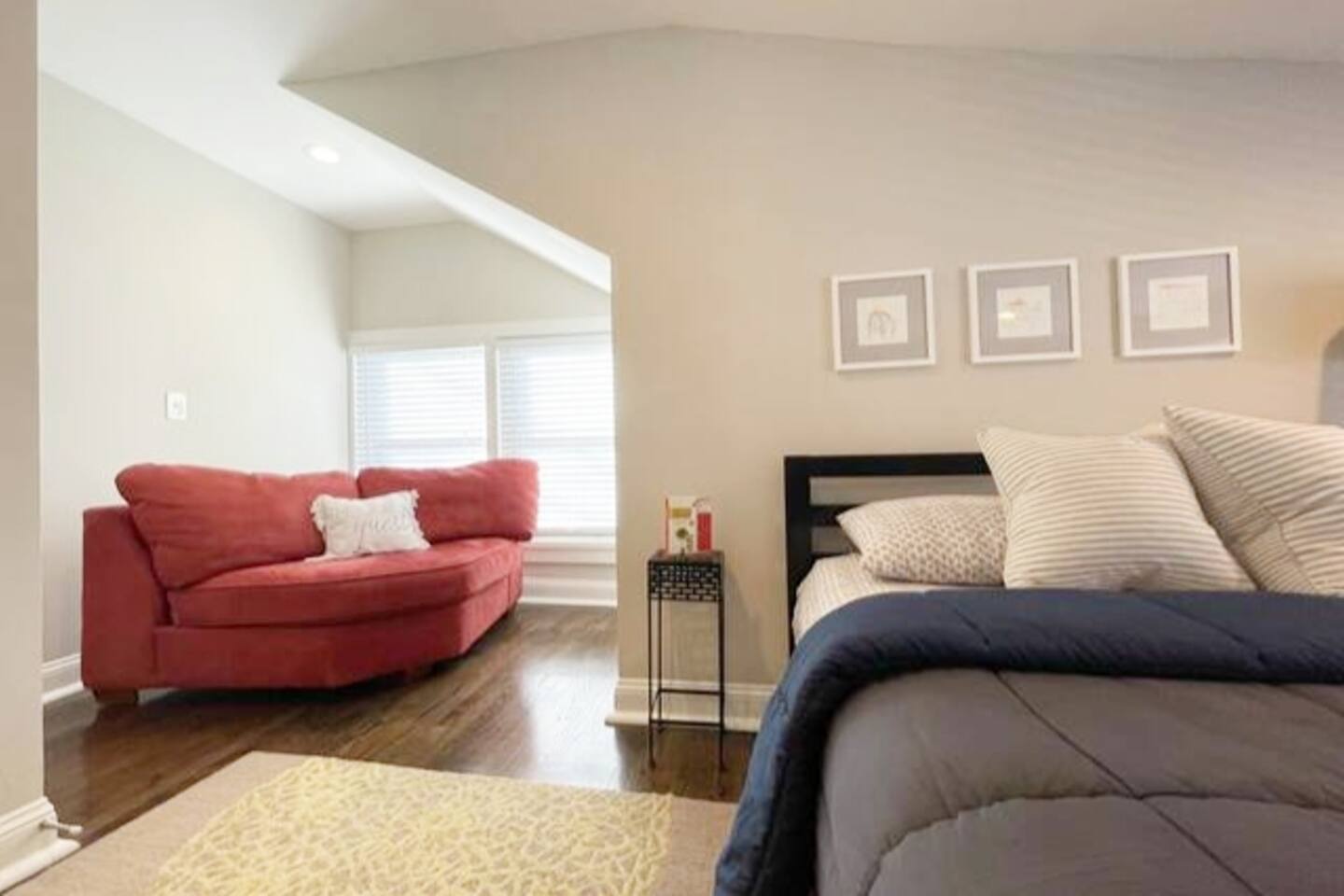 Overview: This is an upstairs studio apartment with the living room and bedroom as one large open space, and separate kitchen. Bedroom - Queen bed Living room - Futon sofa that folds into a twin bed, loveseat, smart TV Bathroom - full bath with shower / tub combo Kitchen - fully stocked with cookware, dishware, utensils, refrigerator, oven/stove, microwave, coffee maker, toaster