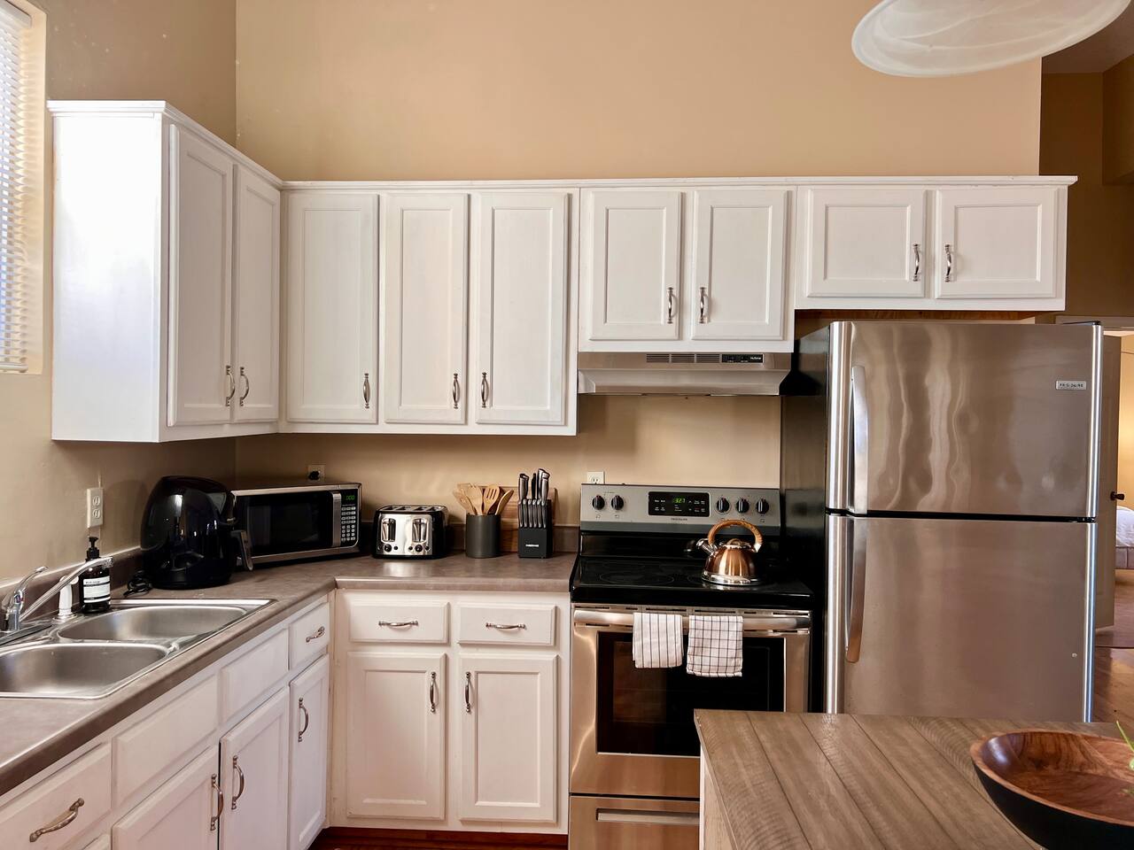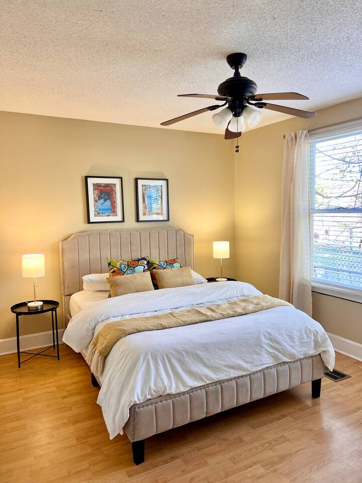 This charming first-floor unit is the perfect blend of comfort and convenience. It features three cozy bedrooms, each with a queen-sized bed, and two full bathrooms. The spacious living room invites you to relax, while the fully equipped kitchen is a cook’s dream, complete with a stylish island for extra prep space and seating. The adjacent dining room offers a cozy spot for enjoying meals together. For added relaxation, there’s a bonus area next to the dining room with a sofa and TV, perfect for extra seating and TV viewing. Plus, the convenience of a washer and dryer, located just off the kitchen, makes it ideal for longer stays. We hope you enjoy every moment in this delightful space! - 3 bedrooms with queen-sized beds - 2 full bathrooms - on-site gated parking - washer and dryer - one block away from FedEx Forum (home of the Grizzlies) - a few blocks away from Beale Street - steps away from the Lorraine Motel and the historic Peabody Hotel with its famous ducks
